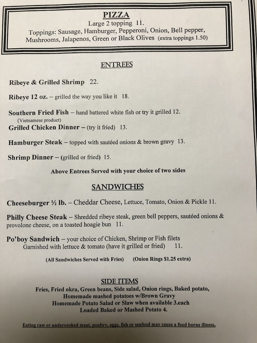 Menu highlights include classic favorites like a perfectly cooked ribeye paired with grilled shrimp, a filling steak dinner with a loaded baked potato and fresh salad, and lighter choices such as crisp house or shrimp salads. The sides keep things simple, with staples like fries and fried okra adding a Southern touch. For drinks, refreshing cocktails like the Caipirinha help round out the experience, especially during their live music nights or karaoke sessions.